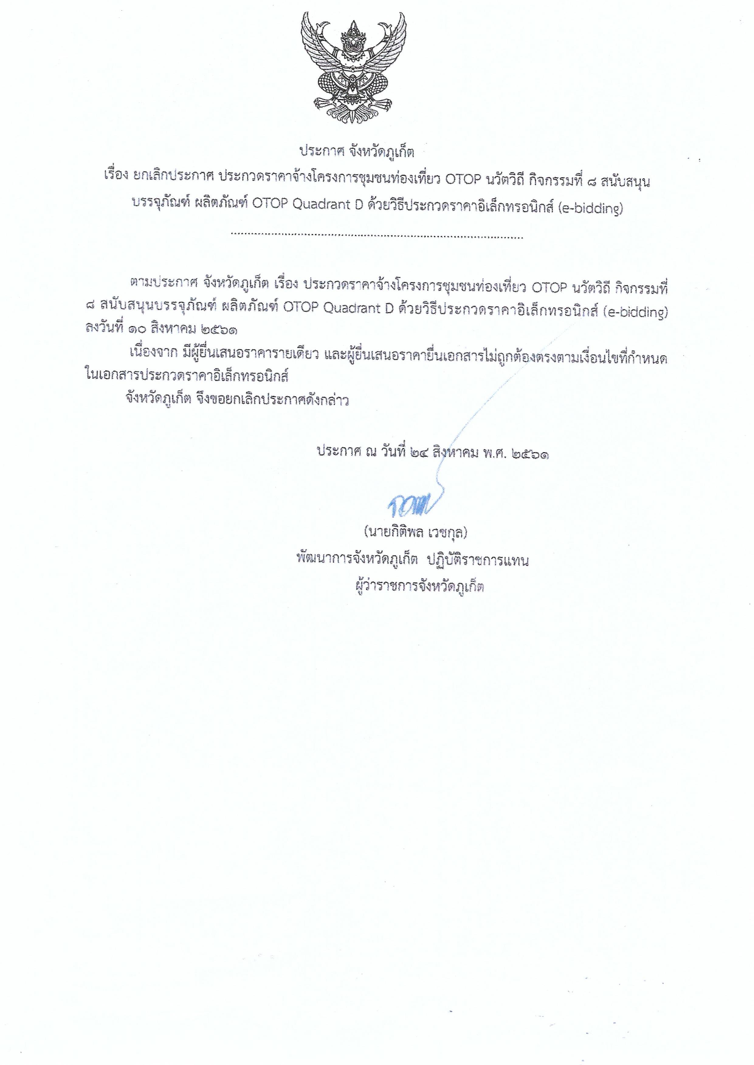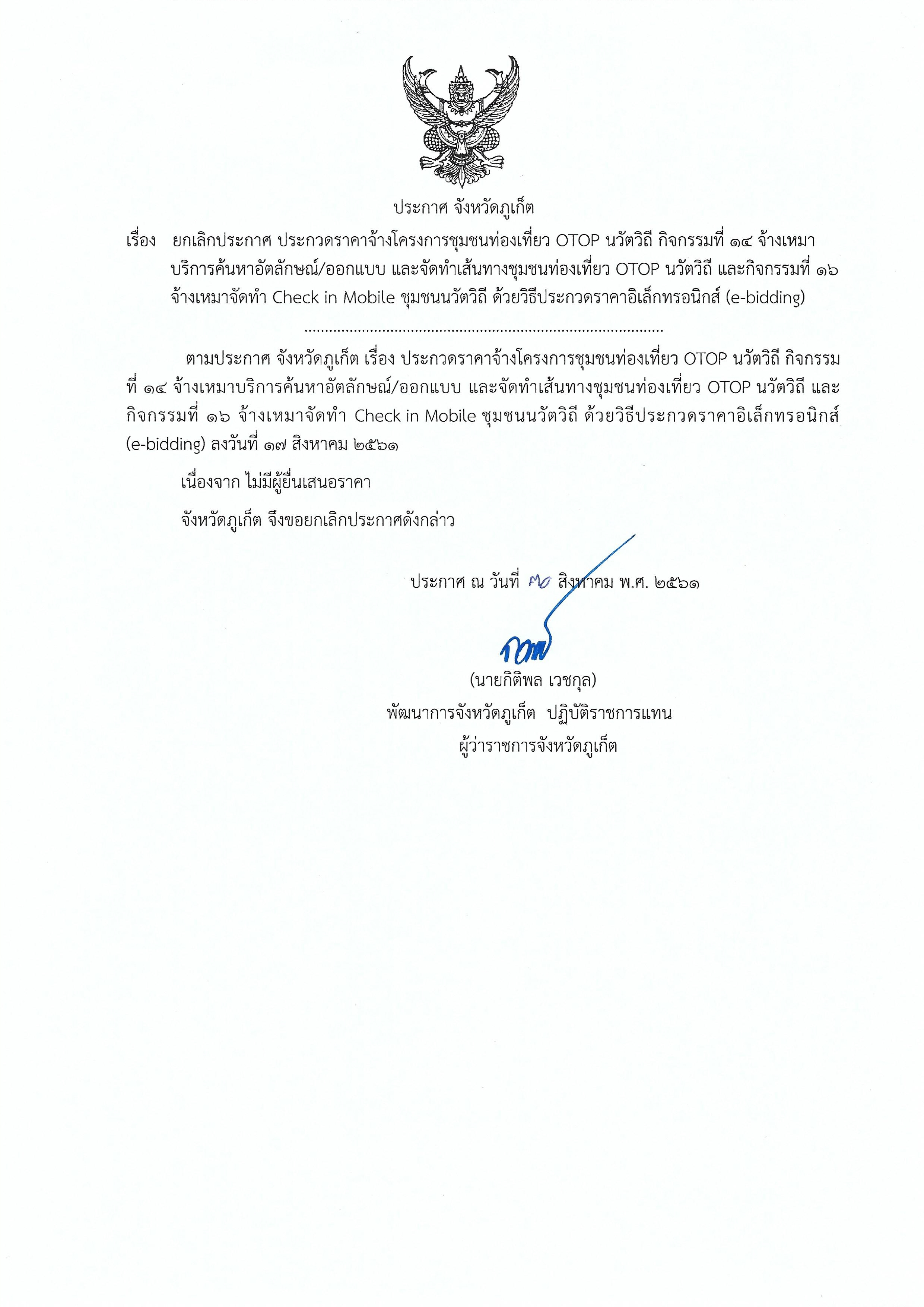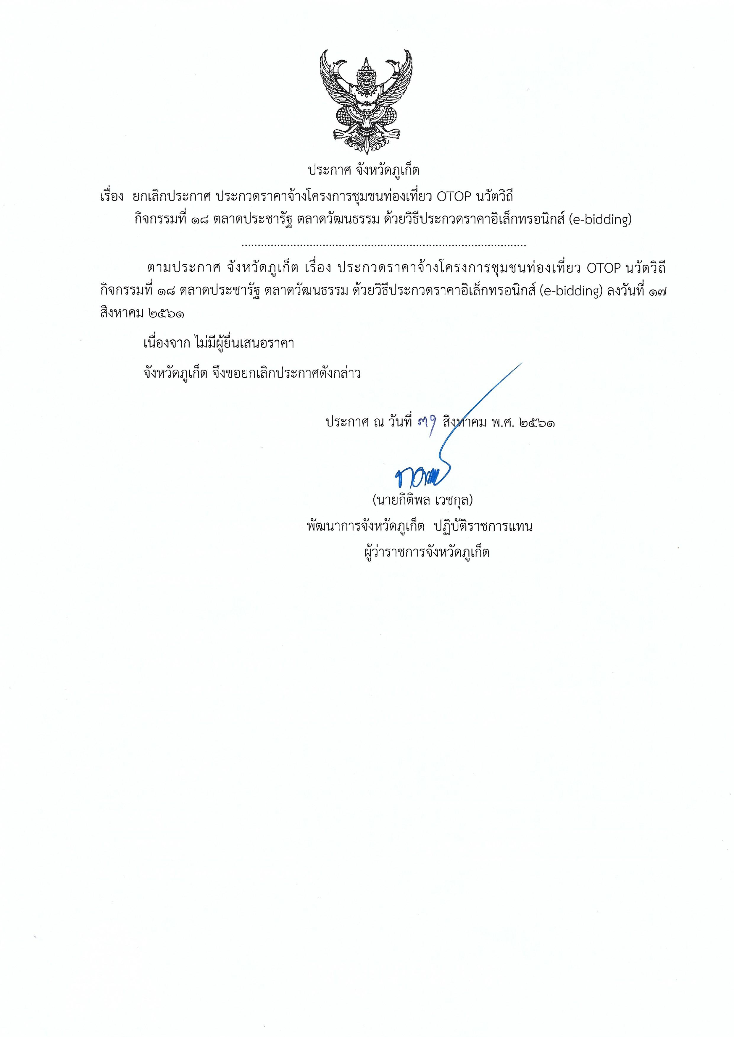 ประกาศจังหวัดภูเก็ต เรื่อง ยกเลิกประกาส ประกวดราคาจ้างโครงการชุมชนท่องเที่ยว OTOP นวัตวิถี กิจกรรมที่ 18 ตลาดประชารัฐ