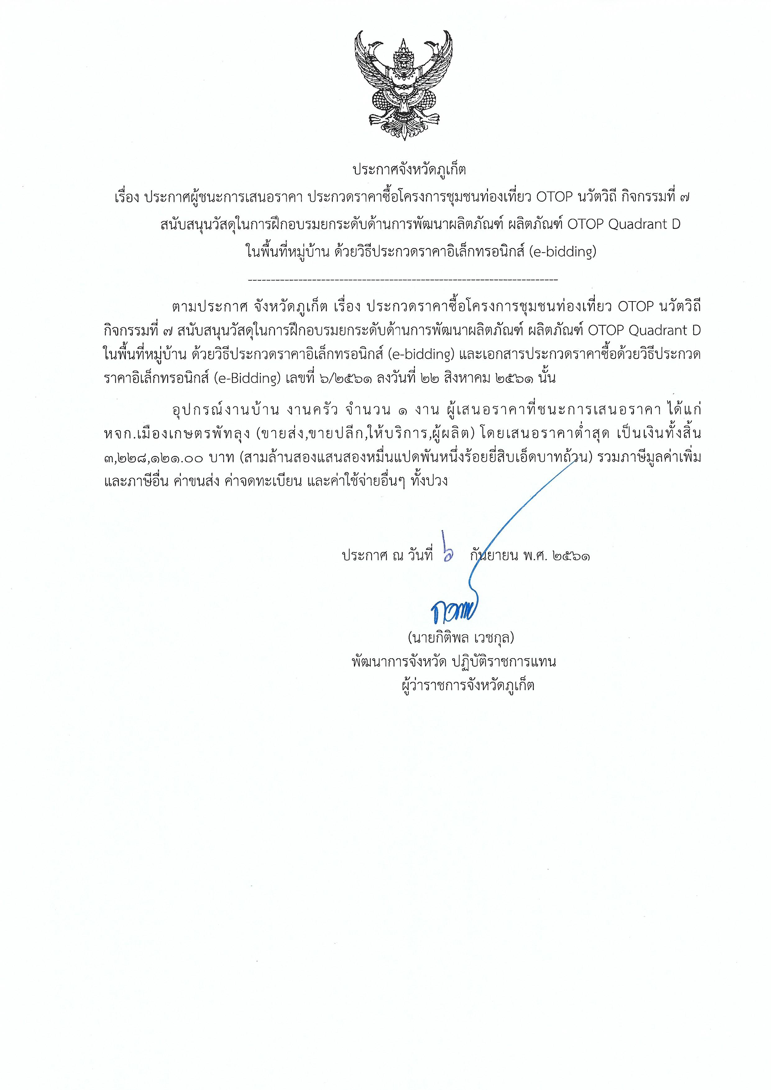 ประกาศจังหวัดภูเก็ต เรื่อง ประกวดราคาซื้อโครงการชุมชนท่องเที่ยว OTOP นวัตวิถี กิจกรรมที่ 7 สนับสนุนวัสดุในการฝึกอบรมยกระดับด้านการพัฒนาผลิตภัณฑ์ OTOP Quadrant D ในพื้นที่หมู่บ้าน ด้วยวิธีประกวดราคาอิเล็กทรอกนิกส์ (e-bidding)