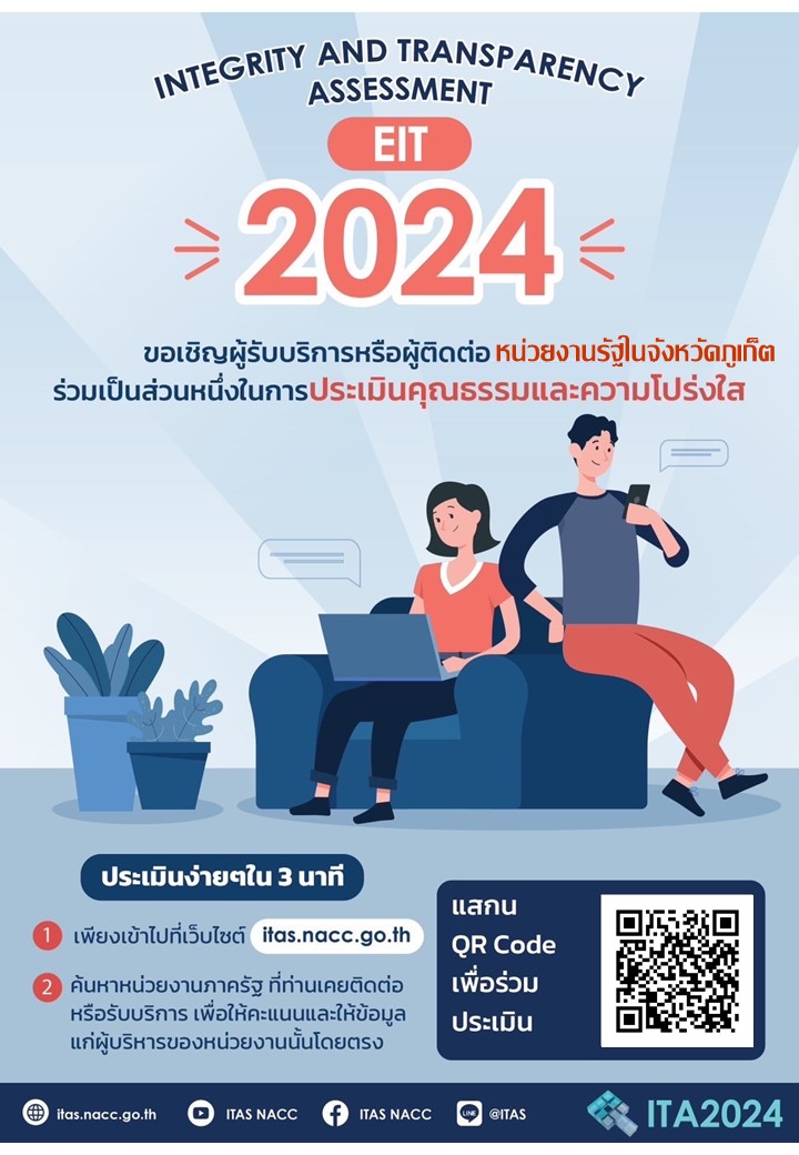 ขอเชิญผู้รับบริการหรือผู้มาติดต่อสำนักงานพัฒนาชุมชนจังหวัดภูเก็ตร่วมเป็นส่วนหนึ่งในการประเมินคุณธรรมและความโปร่งใส (EIT 2024)